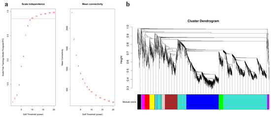 A total of 1602 lncRNAs and 2202 mRNAs were identified from 9 samples from the GSE146627 dataset by cluster analysis (Figure S1). R language was used to verify the data integrity and construct a network topology to determine that the soft threshold power β value was 10 (Figure 2a). Then, based on the soft threshold, we constructed a coexpression matrix. Additionally, we constructed clustering dendrograms by calculating the gene adjacency and dissimilarity coefficients (Figure 2b). Eleven modules (turquoise, blue, brown, yellow, green, red, black, pink, magenta, purple, and grey) were separated with the dynamic shearing method, and the number of lncRNAs and mRNAs in these modules is shown in Table 1.