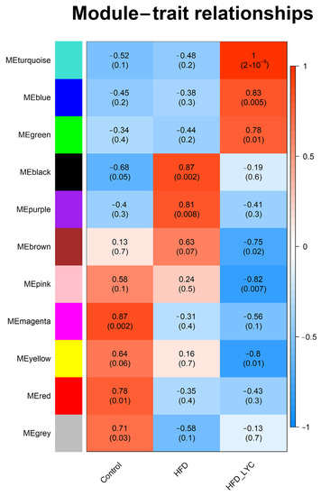 Module–trait relationship. Each row represents a module eigengene and each column represents a trait. Each cell includes the corresponding correlation and p-value. HFD, high-fat diet; HFD-LYC, high-fat diet + lycopene.