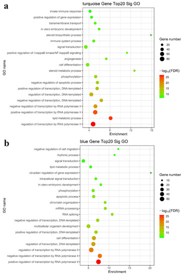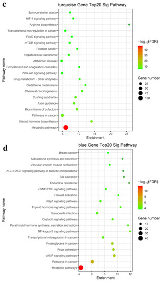 We performed enrichment analysis of the GO terms and KEGG pathways to determine whether these modules consist of functionally similar genes as well as to understand the functional significance of the network modules. The mRNAs in the turquoise, blue, brown, yellow, green, and black modules were subjected to GO and KEGG pathway enrichment analyses. The results showed that the regulation of transcription by RNA polymerase II, lipid metabolic process, apoptotic process, fatty acid metabolic process, steroid biosynthetic process, phosphorylation, RNA splicing, and positive regulation of I-kappa B kinase/NF-kappa B signaling were enriched in the top 20 GO terms, as shown in Figure 4a,b (turquoise and blue modules) and Figure S2a (brown, yellow, green, and black modules). KEGG pathway enrichment analysis suggested that the differentially expressed mRNAs mainly played key roles in metabolic pathways, the TNF signaling pathway, and cytokine–cytokine receptor interaction (Figure 4c,d and Figure S2b). Taken together, these results suggested a strong correlation between the genes in these modules and inflammation and metabolism.