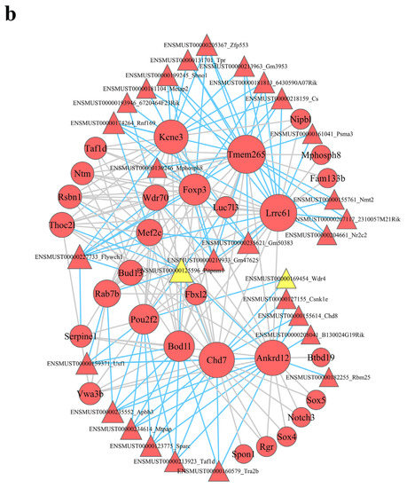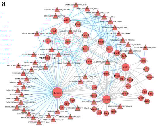 lncRNA–mRNA coexpression networks were built to detect the functional mechanisms of lncRNAs in the key modules (Figure 4). There were 46 lncRNAs and 38 mRNAs as hub genes in the turquoise module (Figure 5a). We detected 29 lncRNAs and 29 mRNAs as hub genes in the blue module (Figure 5b). Hub genes in the brown, yellow, green, and black modules are shown in Supplementary Figure S3. We found that lncRNAs and mRNAs were inter-regulated. Moreover, one lncRNA was coexpressed with multiple mRNAs, and multiple lncRNAs were coexpressed with one mRNA, which revealed a comprehensive regulatory association in the lncRNA–mRNA coexpression networks.