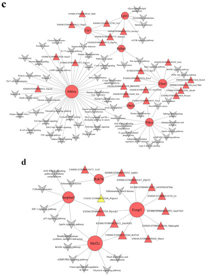 Module lncRNA–mRNA network of hub genes in the turquoise (a) and blue (b) modules. Module lncRNA–mRNA pathway network of hub genes in the turquoise (c) and blue (d) modules. Red circles represent mRNAs, red and yellow triangles represent lncRNAs, and gray polygons represent pathways. The size of the circle represents the regulation capacity of the mRNA, where larger circles indicate relatively stronger regulation capacity.