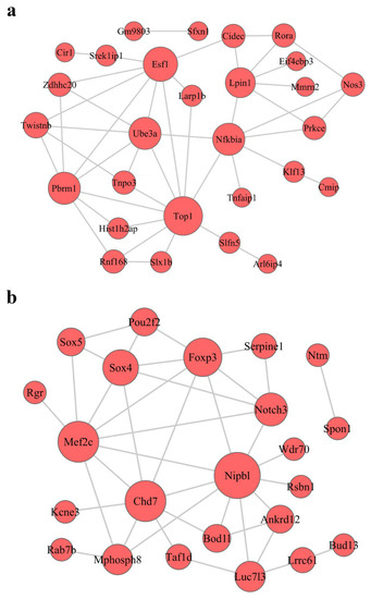 Construction of protein–protein interaction (PPI) networks in the turquoise (a) and blue (b) modules. Red circles represent mRNA; the size of the circle represents the regulation capacity of mRNA, where larger circles indicate relatively stronger regulation capacity.