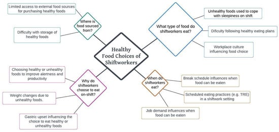 A healthy diet, incorporating both the quality and quantity of food, plays a major role in the health of shiftworkers [,]. As part of a healthy diet, public health policy advocates for a balanced diet consisting of a variety of nutritious foods such as fruits, vegetables, legumes, nuts and wholegrains, with minimal consumption of free sugars, processed foods, and saturated fats [,]. This healthy diet has been shown to be key for health outcomes including a lowered risk of mortality, cardiovascular disease, and cancer []. However, many shiftworkers experience barriers maintaining these healthy eating behaviours, such as environmental, biological, and social factors [,,]. For example, previous research has demonstrated factors such as long working hours, a lack of breaks [], the lack of availability of healthy food during night shifts [], and stress [,] as major barriers to making healthy choices.
