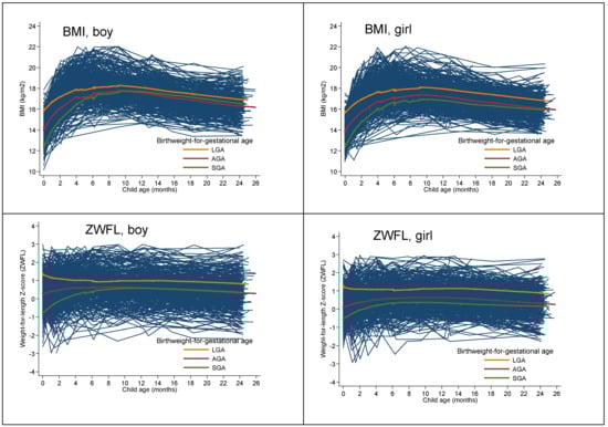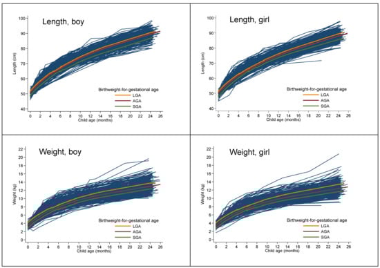 Maternal nutritional status (prepregnancy body mass index (BMI) categories, gestational weight gain (GWG), and gestational diabetes mellitus (GDM)) also are associated with fetal growth and birthweight [,]. Women with obesity and excess GWG are commonly identified as being at increased risk for GDM and delivering infants who are large for their gestational age (LGA) [,]. Adverse health outcomes for infants born with low birthweight (or being small for their gestational age, SGA) have been key drivers of the developmental origins of health and disease (DOHaD) hypothesis [,]. In fact, both LGA and SGA in infancy have been linked to an increased risk of later cardiometabolic diseases []. Identification of infants at increased risk for obesity is the starting point for early interventions that could be adapted to individual risk status []. However, this requires a better understanding of the longitudinal growth patterns of LGA, AGA, and SGA infants, which may provide insights regarding their risk for obesity.