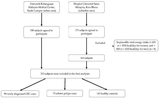 Exclusion criteria included: (1) being pregnant or breastfeeding; (2) having polyps ≥1 cm, tubulovillous adenoma, and high-grade dysplasia; (3) having severe chronic medical illnesses such as neurological diseases, including stroke and muscle disorders, and other cancers; and (4) having a severe internal medical condition requiring dietary restriction such as renal disease, lactose intolerance, or gluten intolerance. The controls were frequency matched on age (±10 years) with cases. Of the 321 subjects who agreed to participate in the study and completed the questionnaire, 4 CRC patients, 1 colonic polyps patient, and 3 healthy controls were excluded due to the implausible total energy intake (<600 or >3500 kcal/day for women, and <800 or >4200 kcal/day for men) [30]. These cut-offs were based on the crude method of excluding the subjects reporting energy intake at the extremes of a range of intake from the analysis. When using a dietary reporting method that cannot provide an accurate estimate of energy intake, such as the food frequency questionnaire (FFQ), then a crude method to account for misreporting may be the best option [31]. Less than 5% of the subjects were ineligible to participate in the study. In total, 313 subjects [n = 99 (CRC patients); n = 73 (colonic polyps); n = 141 (healthy controls)] were included in the final statistical analysis. The selection of subjects is illustrated in Figure 1.