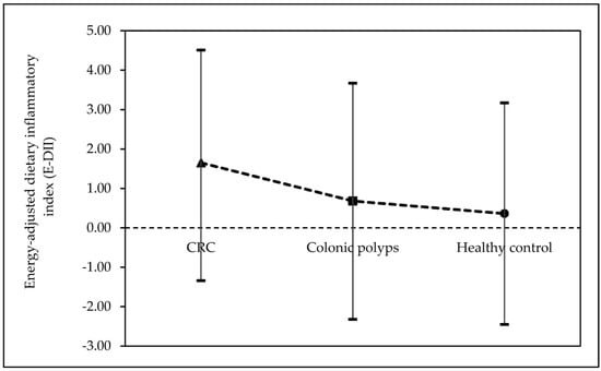 The demographic and other characteristics of the 313 eligible subjects based on the E-DII quartile distribution are shown in Table 1. In this study, the E-DII scores ranged from −2.45 (maximum anti-inflammatory) to +4.51 (maximum pro-inflammatory). The controls reported a more anti-inflammatory diet than the corresponding cases of CRC and colonic polyps (Figure 2). The proportion of CRC subjects increased across the E-DII quartile, while healthy subjects were more prevalent in the lower E-DII quartile (p = 0.004). The mean age of the subjects increased as the E-DII increased (p < 0.001), with subjects in the higher quartile being older (age ≥ 50 years old) than those in the lower quartile (p < 0.001). In regards to ethnicity, subjects in the highest E-DII quartile (Q4) were mostly Malays, while Chinese and Indians were less prevalent (p < 0.001). The proportion of subjects who were employed decreased as E-DII increased (p < 0.001). The educational level also decreased as E-DII increased (p < 0.001). There were more subjects with a bachelor’s degree or higher, while fewer subjects had just completed their primary education. The proportion of subjects living in urban areas increased across the E-DII quartile, whereas subjects living in suburban areas were more prevalent in the lower E-DII quartile (p < 0.001). The family history of CRC and personal history of polyps did not show any notable tendency across the E-DII quartile. Meanwhile, as the E-DII score grew, subjects’ mean dietary energy intake and mean BMI values tended to rise as well (p < 0.001). Subjects in Q4 were more likely to be obese than those in the lower quartile, whereas non-obese subjects were more likely to be in the lowest E-DII quartile (Q1) (p < 0.001). Furthermore, the mean WC, WHR, and BF% values increased as the E-DII score increased for both males and females (p < 0.05).