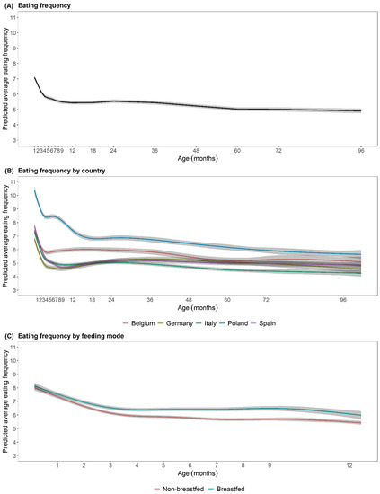 (A) Predicted average eating frequency by age (n = 1244). (B) Predicted average eating frequency by age and country (nBelgium = 163, nGermany = 214; nItaly = 314; nPoland = 214; nSpain = 339). (C) Predicted average eating frequency by feeding mode (n = 1370, whereas 536 infants were breastfed at a given time point). All models are estimated by generalized additive mixed-effects models with EF as outcome and a spline for age in months, a spline for age in months and country and a spline for age in months and feeding mode, respectively, as exposure.