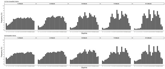 Eating frequency by time-of-day in percentage from total records and by age groups and feeding mode (n = 1370 infants, whereas 536 infants were breastfed at given time point).