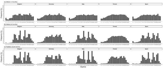 EF by time of the day in children from 1 to 24 months is shown in Figure 2. At 1 month of age, the feeding distribution is almost equally distributed over 24 h. From 2 months onwards, the frequency of feedings during nighttime decreased steadily, and from around 6 months onwards peaks of feeding/eating appear at typical times during morning, midday and evening (Figure 2). EF by daytime showed earlier peaks of preferred meal times in non-breastfed compared to breastfed infants. Nighttime feeding was prevalent longer in breastfed infants (Figure 3). From around 4 months onwards, breastfed infants were fed twice as often during the night (10 pm to 5 am) than non-breastfed infants. With the introduction of complementary feeding, country differences in daytime EF were observed (Figure 4). The distribution is equally distributed during daytime, especially in Poland, though also in Germany. However, the eating distribution between 12–24 months in Germany is more pronounced during the afternoon and evening. Instead, in Belgium, Italy and Spain, there are noticeable peaks of EF. In Belgium and Italy, the first peak is visible between 7 to 8 am followed by noon, 4 pm and 7 pm. In Spain, all peaks were shifted 1 or 2 h later. Children aged 3 to 8 years showed a regular eating pattern with three meals (90% of the children; 8% of the children consumed more than three meals) and a regular snacking pattern with one, two or more than two snacks (28%, 47% and 24% of the children, respectively). Almost all children consumed at least one snack during the afternoons (95%), 62% of the children consumed at least one snack during the mornings and some during the evenings (18%). Children in Poland and Germany consumed (two or more than two times) a snack during the mornings (Poland: 43% and Germany: 20%) and the afternoons (Poland: 66% and Germany: 42%) more frequently.
