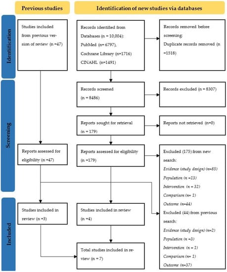 Search results and the process of selection are presented in Figure 1. We identified 10,004 records. After de-duplication and screening of records, 179 (+47) reports were assessed for eligibility. Of these, 175 (+44) reports were excluded (Table S1). Finally, seven studies were included in the review; four from the new search and three from a previous review.