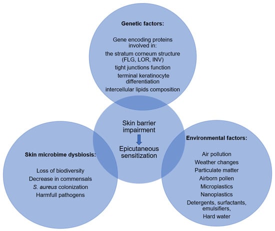 Given that skin barrier impairment play a crucial role in the pathogenesis of atopic dermatitis and food allergy, it seems important to highlight the genetic and environmental factors that promote skin barrier dysfunction and thus increase the risk of epicutaneous sensitization (Figure 2).