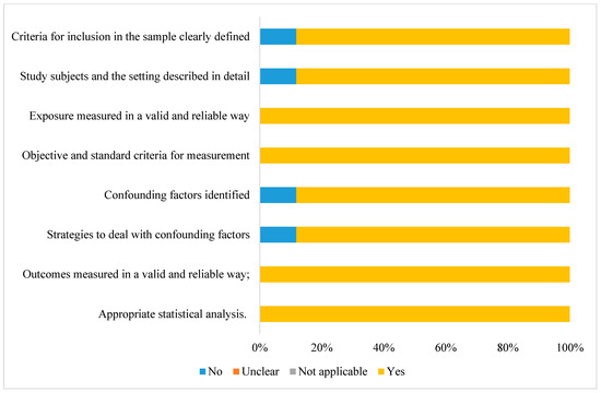 The instrument used to assess the risks of bias was the Joanna Briggs Institute’s recommendation tool for cross-sectional studies [16]. It is composed of the following eight questions: “Inclusion criteria clearly defined in the sample”; “Study subjects and environment described in detail”; “Exposure measured validly and reliably”; “Clearly defined objectives and inclusion and exclusion criteria”; “Confounders identified”; “Strategies for dealing with confounders”; “Validly and reliably measured results”; “Adequate statistical analysis” [16]. This assessment was not used as an inclusion criterion for the studies (Supplementary Material File S3).