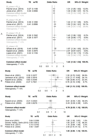 Meta-analysis of the association between food insecurity and anemia (A), low ferritin (B), vitamin D deficiency (C), and vitamin A (D) in adult individuals. The greater chance of anemia among individuals in a situation of food insecurity at any level of involvement. Thus, the chances of having anemia were 1.43 (1.34–1.73) higher among the insecure individuals. Individuals with food insecurity were 1.68 (1.13–2.52) times more likely to have low ferritin. For vitamins D and A, no statistical significance was observed [19,21,22,23,26,28,29,33,35,36].