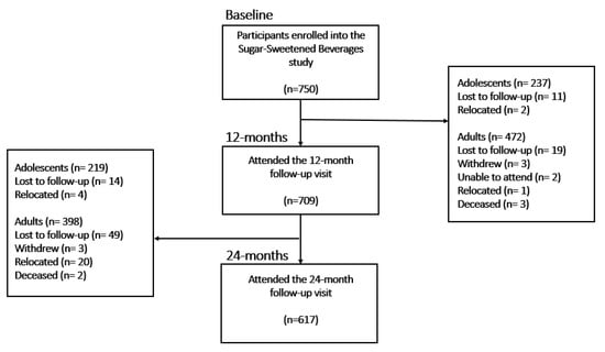 Our study was conducted at the South African Medical Research Council (SAMRC)/Wits Developmental Pathways for Health Research Unit (DPHRU) at Chris Hani Baragwanath Academic Hospital (CHBAH) in Soweto. CHBAH is a public tertiary care institution that provides medical services to the low-income community of Greater Soweto, located in the southwestern area of Johannesburg, South Africa. It is one of the largest hospitals in the world. The peri-urban neighbourhood of Soweto is well known for its established communities, as well as the socioeconomic and cultural diversity that can be found there. We adopted a longitudinal design for our research. The following were the selection criteria for the participants who were part of the study: (i) adolescent boys (n = 125) and girls (n = 125) aged 13–17 years, all of whom needed to be accompanied by their parent/caregiver and who resided in Soweto; (ii) young adult males (n = 125) and females (n = 125) aged 27 years old; and (iii) middle-aged men (n = 125) and women (n = 125) aged 45+ years. A random sampling of households in Soweto was conducted to recruit 250 adolescent participants. In addition, the purposeful selection of 250 young adults who participated in the “Birth to Twenty” cohort study and 250 middle-aged adults from the “Determinants for Type 2 Diabetes Mellitus (T2D)” study was used to obtain 500 adult participants. In total, 750 self-identified black South Africans agreed to take part in the study after being recruited. Before taking part in the study, each participant first provided his or her informed consent in written form. The Human Research Ethics Committee (HREC) of Witwatersrand University, with ethics numbers M170663 and M160604, granted ethical approval (Figure 1).