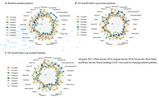 For adolescents and adults, the first PC retained had higher loadings of plant protein, starch, dietary fibre, iron, magnesium, zinc, vitamin B6, riboflavin, thiamine and folate over the 24 months. It was named “Plant-driven nutrients”. The second PC was named “animal-driven nutrients” because it had high positive loadings of vitamin B12, vitamin D, cholesterol, phosphorus, riboflavin, animal protein, phosphorus, calcium, retinol, saturated fat, monounsaturated fat and folate over the 24 months. The third PC was named “fat-driven nutrients”. This nutrient pattern had high positive loadings of saturated fat, monounsaturated fat, polyunsaturated fat, cholesterol, retinol, animal protein and vitamin E. The fourth extracted PC had high loadings of animal protein, calcium, potassium, phosphorus, monounsaturated fat, polyunsaturated fat, vitamin B12, vitamin E, vitamin D and vitamin C. As a result of these positive loadings, this nutrient pattern was named “Plant and Dairy-driven nutrients” (Figure 3). Factor loadings ≥ 0.47 were used for naming the nutrient patterns.