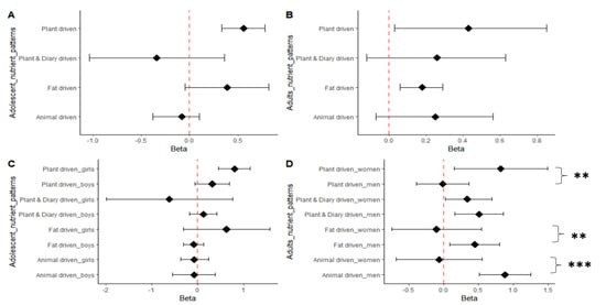 Sex differences in the association of nutrient patterns with BMI. (A). Nutrient pattern associations of nutrient patterns with BMI in SA adolescent boys and girls. (B). Nutrient pattern associations of nutrient patterns with BMI in SA men and women. (C). Sex–stratified nutrient patterns in adolescents. A significant sex*plant–driven nutrient pattern on BMI was noted at (p < 0.05). (D). Sex–stratified nutrient patterns in adults. All associations are adjusted for age, gender, household socio-economic status and energy intake reporting. A significant sex*plant–driven nutrient pattern on BMI was noted at ** (p < 0.01), the sex*animal–driven nutrient pattern on BMI was noted at *** (p < 0.001) and the sex*fat–driven nutrient pattern on BMI was noted at ** (p < 0.01).