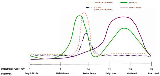 Hormonal changes across the six menstrual cycle subphases. The figure represents changes from a 28 day menstrual cycle. The cycle duration and ovulation timing, however, vary both within and between women.