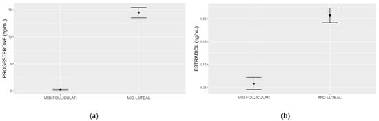 Progesterone (a) and estradiol (b) measured by ultraperformance liquid chromatography tandem mass spectrometry. The mean and standard error mid follicular and mid-luteal subphase progesterone values were 0.26 (0.08) ng/mL and 14.46 (0.95) ng/mL, respectively (a). The mean and standard deviation early follicular and mid-luteal subphase estradiol values were 0.08 (0.01) ng/mL and 0.20 (0.01) ng/mL, respectively (b).