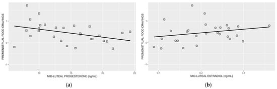 In Figure 3a,b, we show associations between premenstrual food cravings and mid-luteal progesterone and mid-luteal estradiol, respectively.
