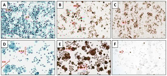 Cytochemical (Papanicolaou stain (A,D)) and immunocytochemical sections (CK AE/AE3 stain (B,E); CD45 stain (C,F)) of HM cells of colostrum (A–C) and mature HM (D–F). Note: *, leukocytes; **, glandular epithelial cells; ***, apocrine secretions of lipid globules.