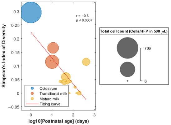 No significant differences (Wilcoxon ranksum test, p-value < 0.05) were found in the number of total cells or the proportions of cells of the individual cell types (i.e., epithelial cells, leukocytes, and keratinocytes) between mothers with male and female infants, spontaneous vaginal delivery and caesarean section, and term (i.e., gestational age ≥37 weeks) and preterm delivery (gestational age < 37 weeks). As shown in Figure S1, a significant, linear decrease in the overall cell count and proportion of leukocytes with postnatal age was observed, while the amount of glandular epithelial cells increased linearly along lactation (Pearson correlation, p-value < 0.05). No upward or downward trend of %keratinocytes with postnatal age was observed. Simpson Index of Diversity was calculated as a surrogate of cell diversity in HM samples and its correlation with postanal age was evaluated. Figure 2 shows a decrease in the cell count and diversity as a function of lactation age.