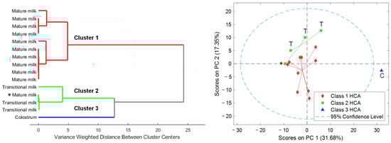 Dendrogram of the HCA (Ward’s method, 1 principal component) of the abundances of different cell types in the HM samples (left). PCA scores plot of the metabolomic fingerprints (right). Note: Classes 1 to 3 obtained from HCA of HM cell composition. C, colostrum; T, transitional milk; otherwise, mature milk.