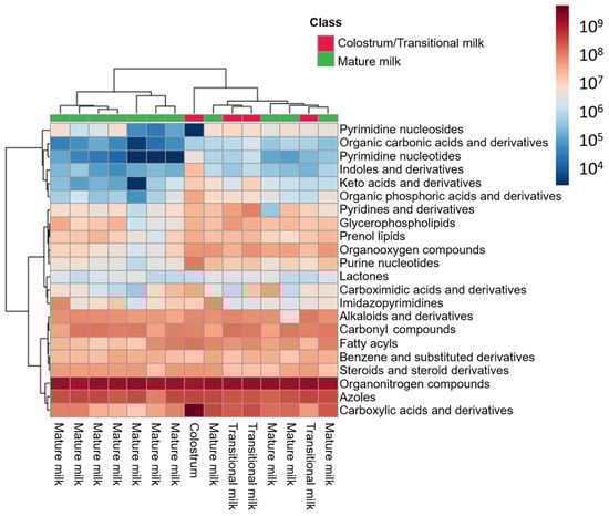 Regarding the colostrum sample, overall, higher abundances for all metabolite classes and in particular for certain metabolites (e.g., L-leucine) compared to transitional and mature milk samples were observed. However, statistical comparisons between the groups were not performed due to the small sample size involved.