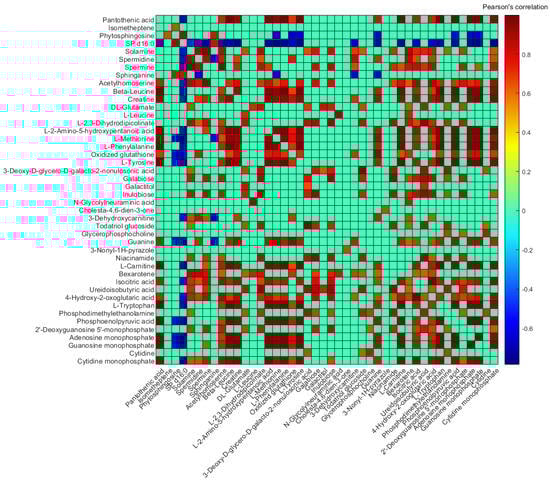 Pearson’s paired correlation between unique metabolites. Note: For better visualization, those correlations considered non-significant (p-value < 0.01) are given an r-value = 0, and those metabolites that did not correlate significantly with any other metabolite are not shown.