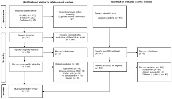 To our knowledge, several systematic [37,38,39,40,41,42,43] and narrative reviews [19,24,44,45] have focused on dietary patterns and sarcopenia. Some of them have grouped all healthy dietary patterns together [37,39] or were not conducted in older adults [37,40]. Other reviews were focused on the role of diet and/or dietary patterns in sarcopenia in pathological states, such as cancer [46,47]. The latest systematic review and meta-analysis examined healthy dietary patterns, in general, in relation to sarcopenia [39] or had a special focus on developing countries [43]. None of the latest works, however, assessed the Mediterranean diet as a distinct ontology [39,43], except the systematic review of Jang et al., in which only prospective cohort studies were included [42]. Last but not least, several recent studies have been published [48,49], which were not considered in the previous reviews, the majority of which (8 out of 11) were published up to 2020 [19,24,37,38,40,41,44,45].