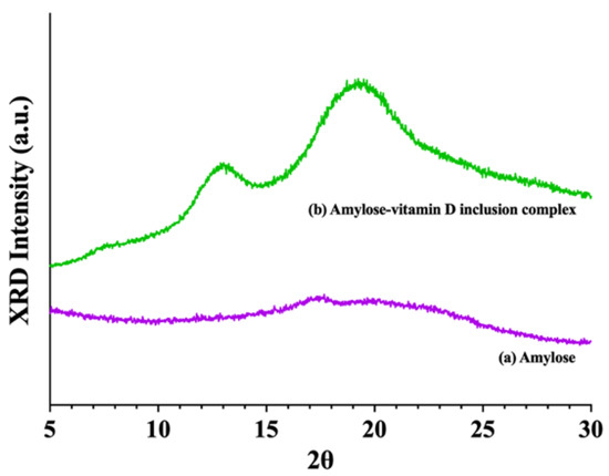 X−ray diffraction (XRD) patterns. (a) Amylose; (b) amylose–vitamin D inclusion complex (IC).