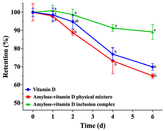 In addition to blocking UV irradiation, encapsulating vitamin D into the polymeric matrix may also be a good strategy to offer defense against other harsh conditions. The results of the thermal stability experiments are shown in Figure 5. After incubating at 37 °C for 2 d, only about 1.3% of vitamin D was degraded in amylose–vitamin D IC group, which corresponded to a 98.7% ± 2.5% retention of vitamin D. After 4 d of storage at 37 °C, the effectiveness of IC in improving the thermal stability of vitamin D started to show, and its retention of vitamin D was significantly higher than vitamin D and amylose–vitamin D PM groups (p < 0.05). After the heat treatment for 6 d, the retention of vitamin D was 89.2% ± 3.4% in the amylose–vitamin D IC, compared with 69.9% ± 1.5% in the pure vitamin D and 64.9% ± 1.1% in the amylose–vitamin D PM sample. The dense crystalline structure of amylose–vitamin D IC precluded direct contact between vitamin D and oxidizing substances, therefore providing a protective effect on vitamin D [18].