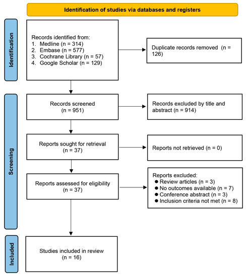 The database screening process is shown in Figure 1. A literature search identified 1077 citations in total. Following the removal of duplicates (n = 126), the titles and abstracts of the remaining 951 articles were examined. Further removal of 914 studies following examination of their titles and abstracts gave 37 articles for full-text review. Finally, 16 observational studies that fulfilled the inclusion criteria, published from 2013 to 2021, involving 47648 individuals, were meta-analyzed for the present investigation [7,18,19,20,28,29,30,31,32,33,34,35,36,37,38,39] (Figure 1).