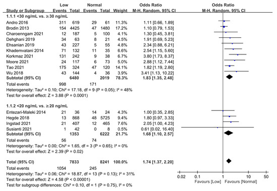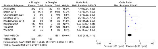 Subgroup analysis comparing the risk of venous thromboembolism between participants with vitamin D insufficiency and those with a normal vitamin D status. CI, confidence interval; M-H, Mantel-Haenszel. The measure of effect (e.g., an odds ratio) for each of these studies is represented by a square incorporating confidence intervals represented by horizontal lines. The vertical line is “Line of no effect”. The area of each square is proportional to the study’s weight in the meta-analysis. This meta-analysed measure of effect is plotted as a diamond, the lateral points of which indicate confidence intervals for this estimate [18,19,28,29,30,35,38,39].