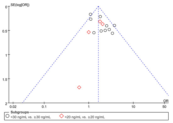 A low vitamin D level was defined as 25(OH)D level <20 ng/mL and <30 ng/mL in four [32,33,34,37] and ten studies [18,19,28,29,30,31,35,36,38,39], respectively. A pooled analysis of the association between vitamin D status (i.e., low vs. normal) and the overall risk of VTE demonstrated that a low vitamin D level was significantly associated with an increased risk of VTE when analyzed with a random-effects model (OR = 1.74, 95% CI: 1.37 to 2.20, p < 0.00001; I2 = 31%, 14 studies, 16,074 individuals) (Figure 2) [18,19,28,29,30,31,32,33,34,35,36,37,38,39]. The funnel plot did not reveal evidence of significant asymmetry (Figure 3), suggesting a low risk of publication bias. Meta-analysis of the four studies [28,33,37,39] that provided the adjusted OR for analyzing the impact of a low vitamin D level on the risk of VTE also showed a positive association between the former and the latter (adjust OR: 1.71, 95% CI:1.24 to 2.38, p = 0.001, I2 = 45%, 7503 patients) (Figure not shown).