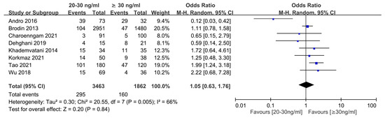 Eight studies were available to analyze the dose-dependent association of vitamin D level with the risk of VTE [18,19,28,29,30,35,38,39]. The results showed that the risk of VTE in individuals with vitamin D deficiency [i.e., 25(OH)D level <20 ng/mL] was higher than that in those with 25(OH)D level ≥30 ng/mL) (OR = 2.03, 95% CI: 1.33 to 3.11, p = 0.001; I2 = 65%, eight studies, 4564 individuals) (Figure 5) [18,19,28,29,30,35,38,39]. Omitting certain trials had no significant effect on the results of the sensitivity analysis. Merged results from eight studies revealed no significant difference in the risk of VTE in individuals with vitamin D insufficiency [i.e., 25(OH)D level of 20–30 ng/mL] compared to those with 25(OH)D level ≥30 ng/mL (OR = 1.05, 95% CI: 0.63 to 1.76, p = 0.84; I2 = 66%, eight studies, 5325 individuals) (Figure 6). Sensitivity analysis demonstrated that a 25(OH)D level of 20–30 ng/mL was associated with an increased risk of VTE when one study was removed [28].