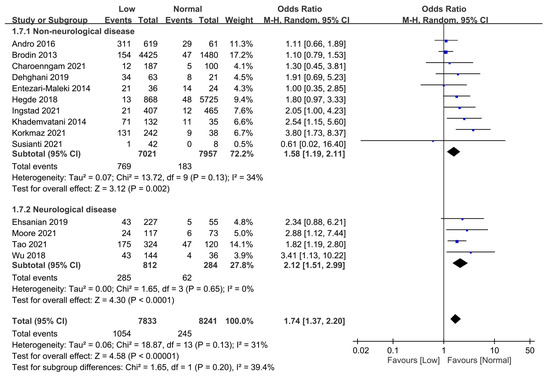 Subgroup analysis on the effect of the presence of neurological diseases (i.e., with vs. without neurological diseases) on the correlation between serum vitamin D level and the risk of venous thromboembolism. CI, confidence interval; M-H, Mantel-Haenszel. The measure of effect (e.g., an odds ratio) for each of these studies is represented by a square incorporating confidence intervals represented by horizontal lines. The vertical line is “Line of no effect”. The area of each square is proportional to the study’s weight in the meta-analysis. This meta-analysed measure of effect is plotted as a diamond, the lateral points of which indicate confidence intervals for this estimate [18,19,28,29,30,31,32,33,34,35,36,37,38,39].