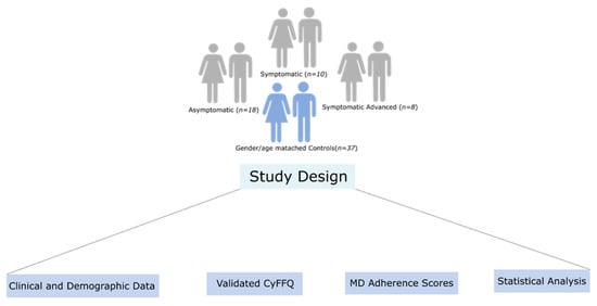 Additionally, our study used the Cyprus FFQ (CyFFQ), a semi-quantitative validated FFQ, for assessing the dietary intake of the Cypriot population, which provides a detailed assessment of culture-specific intake and Western foods []. The present investigation thus aimed to investigate the dietary intake and MD adherence scores of Cypriot HD patients who are either (i) asymptomatic, (ii) symptomatic and (iii) symptomatic advanced versus gender/age-matched controls using the CyFFQ to identify any associations between MD adherence and disease stage. It was hypothesized that high adherence to the MD would be associated with delayed disease symptoms and a better quality of life due to higher consumption of neuroprotective and anti-inflammatory foods.