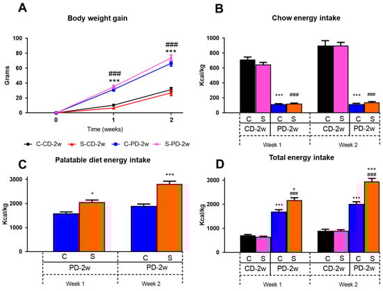 Effect of stress and a palatable diet on body weight and energy intake. (A) Body weight (b.w.) gain of the control (C) or stressed (S) rats fed a regular chow diet (CD) or palatable diet (PD, chocolate milk ingestion) for 2 weeks (C-CD-2w, S-CD-2w, C-PD-2w, and S-PD-2w), n = 6 rats/group in C-CD-2w and S-CD-2w; n = 20 rats/group in C-PD-2w and S-PD-2w. (B) Chow energy intake, (C) Palatable diet energy intake, and (D) Total energy intake (Kcal/Kg b.w.), n = 3 cages/group in C-CD-2w and S-CD-2w; n = 10 cages/group in C-PD-2w and S-PD-2w. Values are the mean ± SEM. *** p < 0.001 vs. C-CD-2w; ### p < 0.001 vs. S-CD-2w, + p < 0.05, +++ p < 0.001 vs. C-PD-2w.