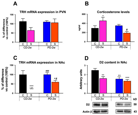 Effect of stress and palatable diet intake on neuroendocrine and limbic parameters. (A) TRH mRNA expression in the hypothalamic paraventricular nucleus (PVN), (n = 3–4 rats/group). (B) Serum corticosterone levels, (n = 3–6 rats/group). (C) TRH mRNA expression in the nucleus accumbens (NAc), (n = 3–4 rats/group). (D) Dopamine receptor type 2 (D2) content in the NAc., (n = 3–4 rats/group). Data represent the mean ± SEM of mRNA levels expressed as arbitrary units (A,C), ng/mL (B), and optical density arbitrary units (D). U.D.: undetectable. * p < 0.05, ** p < 0.01, *** p < 0.001 vs. C-CD-2w; # p < 0.05, ### p < 0.001 vs. S-CD-2w.