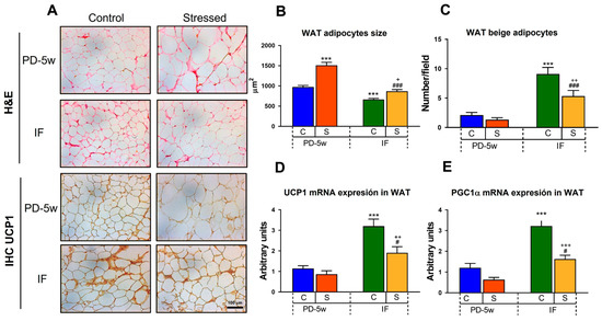 Effect of stress and intermittent fasting on adipose tissue morphology and thermogenesis parameters. (A) Representative photomicrographs of hematoxylin and eosin (H&E) and UCP1 immunostaining of mesenteric white adipose tissue (WAT) at 20X magnification of the control or stressed animals fed with a PD and subjected to two feeding schedules: food available all day (with a cumulative intake time of 5 weeks, C-PD-5w, S-PD-5w) or intermittent fasting (C-IF, S-IF) for 3 additional weeks. Scale bar 100 µm. (B) Mesenteric adipocytes’ size. Data are represented as the mean ± SEM of µm2. (C) Number of beige adipocytes per field analyzed. Data are represented as the mean ± SEM of the total number of adipocytes/field. (D) UCP1 and (E) PGC1α mRNA expression in the WAT. Values are the mean ± SEM of the relative abundance of mRNA levels expressed in arbitrary units. n = 4 rats/group. *** p < 0.001 vs. C-PD-5w; # p < 0.05, ### p < 0.001 vs. S-PD-5w; + p < 0.05, ++ p < 0.01, +++ p < 0.0001 vs. C-IF.