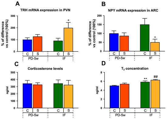 Effect of stress and intermittent fasting on neuroendocrine parameters. (A) TRH mRNA expression in the hypothalamic paraventricular nucleus (PVN) and (B) NPY mRNA expression in the hypothalamic arcuate nucleus (ARC) of the control or stressed animals fed with a PD and subjected to two feeding schedules: food available all day (with a cumulative intake time of 5 weeks, C-PD-5w, S-PD-5w) or intermittent fasting (C-IF, S-IF) for 3 additional weeks. Values are the mean ± SEM of the mRNA levels expressed in % of difference vs. C-PD-5w (n = 4 rats/group). (C) Corticosterone and (D) T3 serum levels expressed as ng/mL. Data are the mean ± SEM (n = 4 rats/group). ** p < 0.01 vs. C-PD-5w; ## p < 0.01 vs. S-PD-5w; + p < 0.05 vs. C-IF.