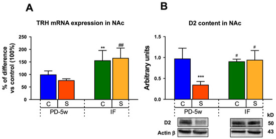 When analyzing the NAc TRH mRNA expression in both the C-IF and the S-IF animals, we observed an increment when compared to their respective all-day-fed controls (C-PD-5w and S-PD-5w), (Figure 7A). Two-way ANOVA showed that the feeding schedule had a significant effect of F(1,14) = 5.80, p < 0.05.