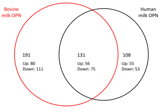 A Venn diagram was constructed to show the relationship between DEGs regulated by human and bovine milk OPN (Figure 2). Among the 239 and 322 DEGs in the human and bovine OPN groups, 131 DEGs were observed after both treatments, showing that 55% of the genes modulated by human OPN were also modulated by bovine OPN. Among the 131 shared DEGs, 56 were upregulated (43%) and 75 genes were downregulated (57%) and except for a single gene (NEDD4), all of the 131 shared DEGs were similarly up- or downregulated by human and bovine milk OPN, respectively (Table S1). When analyzing the twenty most up- and downregulated DEGs after treatment with human milk OPN using more stringent thresholds (P-adj < 0.01, and |log2FC| > 1), the similarity of the human and bovine OPN groups increases to 75% (Table 2 and Table 3).