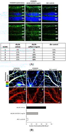 The number of vascular extravasations was significantly reduced in non-diabetic mice compared with diabetic mice treated with vehicle. A lower rate of vascular extravasations was observed in diabetic mice treated with caffeine eye drops in comparison with those treated with vehicle, but the difference was not statistically significant (Figure 1B).