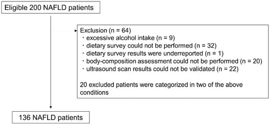 We recruited 200 patients with suspected fatty liver on ultrasonography from September 2021 to November 2022 for a prospective cohort study of patients aged 20 years or older who attended the Department of Hepatology, Osaka Metropolitan University Graduate School of Medicine. We performed a cross-sectional analysis using baseline data. Of the 200 patients, we excluded 9 patients with excessive alcohol intake (>30 g/day in male; >20 g/day in female) [20], 32 patients for whom a dietary survey could not be performed, 1 patient whose dietary survey results were underreported, 20 patients for whom body composition assessment could not be performed, and 22 patients whose ultrasound scan results could not be validated. Because 20 excluded patients were categorized in two of the above conditions, 64 patients were excluded and 136 patients were included in the final analysis (Figure 1). In accordance with the Declaration of Helsinki, written informed consent to participate in the study was obtained from all patients prior to the start of the study. The study was approved by the Ethics Committee of Osaka City University (now known as Osaka Metropolitan University) School of Medicine (approval number: 2021-088; approval date: 17 June 2021).