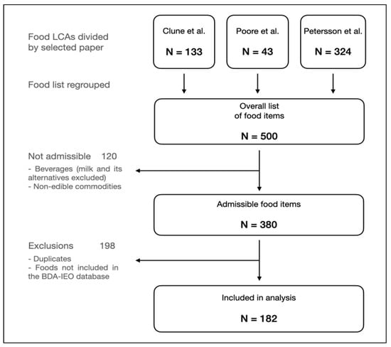 Flow chart of the food product selection. Abbreviations: LCAs = life cycle assessments [,,].