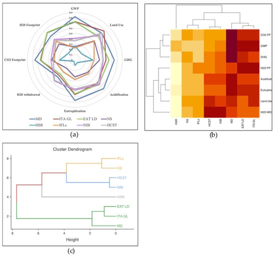 Figure 2 provides different visual inspections of the values reported in the correlation matrix in Table 2. In Figure 2a, a radar chart was carried out from the eight emission indicators correlated to the eight food scales mapped. External lines correspond to higher correlations and as shown in the radar chart, three lines highlight strong correlations (MD, ITA GL, and EAT Lancet), two lines have moderate correlations (NIB and HCST), two lines with low correlations (NS and IFLs), and the most internal line has weak correlation (HSR). A similar pattern emerges from the heatmap of the cluster analysis, in Figure 2b, which was performed to understand which food scale might have similar behavior with respect to the environmental indicators. Moving from left to right (brighter colors indicate lower absolute correlation values), there is HSR, followed by NS and Israeli WLs, then in the middle, HCST and NIB, and the healthy and sustainable diet on the right side of the map.