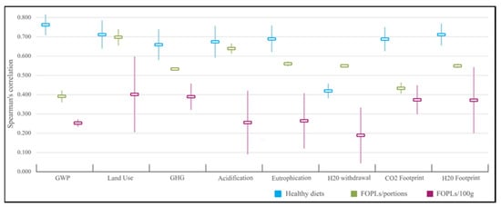 Based on the results of the cluster analysis and the intrinsic characteristics of each of the selected food scales, another evaluation was then carried out by dividing the eight food scales into three groups and calculating the average of the Spearman’s correlations reported in Table 2 for each group. The three groups were: healthy diets (HDs, comprising MD, ITA GL, and EAT Lancet), food scales based on portions (FOPL/portions, NIB and HCST), and FOPLs based on 100 g reference (FOPLs/100 g, NS, IFLs, and HSR). In Figure 3, it can be observed that HDs correlated better, on average, for all indicators, reaching a maximum in GWP (HDs = 0.762). Between the two FOPL groups, FOPLs/portions showed higher correlations than FOPLs/100 g for all the indicators. Finally, FOPLs/100 g not only showed lower correlation values, but also higher variability (as highlighted by the wide standard deviations).