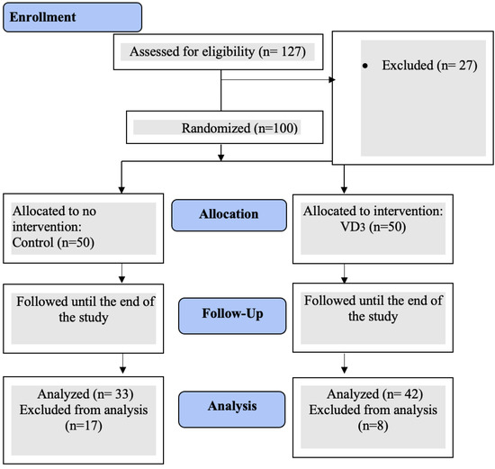 Before and after the VD3 supplement, baseline and follow-up values of anthropometric and clinical parameters were collected. At the conclusion of the 8-week interventional phase, the subjects underwent a 2-week washout phase before and following VD3 administration. VD3 is a fat-soluble vitamin with a long half-life; a washout period was achieved to avoid the potential effect of its cumulative dose. Then, all participants’ follow-up measurements were obtained. An independent statistician developed a computer-generated randomization process. According to the consortium chart (Figure 1), hundreds of eligible participants were divided into two groups: group 1 received once weekly 50,000 IU of VD3 in a Hi-Dee soft gelatin capsule (United Pharmaceuticals Company, Amman, Jordan). Participants in group 2 did not receive any supplementation and acted as the control group. In compliance with the Endocrine Society’s clinical guidelines for treating VDD in adults, therapeutic protocols for VD3 supplements were approved [19]. Similarly, administering VD3 to individuals throughout 12 months produced no toxicity [19]. All participants’ adherence to the therapy protocol was monitored by periodic text messages sent to their mobile phones.