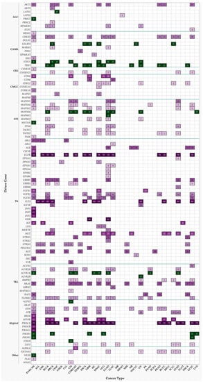 The resulting modified proteins alter their enzymatic activity (especially, if the substrate is another protein kinase participating amplifying signal transduction towards their own downstream targets), change their intracellular localization, their turnover, or acquire/lose the ability to interact with other proteins. Protein kinases regulate various cellular physiological events, among which there are cell cycle control and progression, response to extracellular stimuli, cell survival, apoptosis, differentiation, metabolic control, migration, and DNA damage response [,,]. These are among the key cellular functions, the disruption of which contributes to the development of cancer [,,]. Genes whose mutational alteration results in dysfunction of their protein products grant the selective net advantage to a cell to collectively acquire diverse hallmark capabilities of cancer [,,], i.e., drive the progressive transformation of a normal cell into a malignant one; they are called drivers [,]. There are 102 protein kinases identified as drivers of various types of cancer [,]. Mutations in these genes were found to be associated with the key oncogenic events in The Cancer Genome Atlas (TCGA) projects of various cancer types as well as in the Pan-Cancer studies. Many of these protein kinases have been targets of pharmacological inhibition and respective drug development in the realms of cancer treatment that were approved by the United States Food and Drug Administration (USFDA) [,,]. All this information is also summarized in Figure 1 and Supplementary Tables S1 and S2, quantifying the number of drugs developed for particular protein kinases. The information about available pharmacological inhibitors was obtained from the International Union of Basic and Clinical Pharmacology (IUPHAR)/British Pharmacological Society (BPS) Guide to PHARMACOLOGY [] and provided in the Supplementary Table S3. Among these, protein kinase inhibitors have been most actively developed for kinase insert domain receptor (KDR, also known as vascular endothelial growth factor receptor 2, VEGFR-2), epidermal growth factor receptor (EGFR), phosphatidylinositol-4,5-bisphosphate 3-kinase catalytic subunits (PIK3CA/B/G), Janus kinases (JAK1/2/3), and Fms related receptor tyrosine kinase 3 (FLT3).